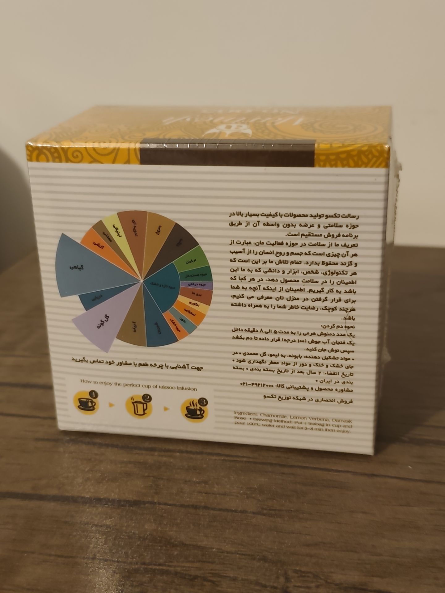 🎀دمنوش بابونه تکسو، ترکیبی آرامشبخش و طبیعی از بابونه، بهلیمو و گلمحمدی است که بهویژه برای تسکین استرس و اضطراب طراحی شده است. دمنوش بابونه تکسو بدون افزودنی و نگهدارنده شیمیایی، از ترکیب تازهترین و مرغوبترین گیاهان ساخته شده. در تی بگهای ابریشمی با جدیدترین تکنولوژیهای روز دنیا بستهبندی میشود. مزیت این نوع بسته بندی، حفظ طعم و رنگ بیشتر دمنوش است.🎀